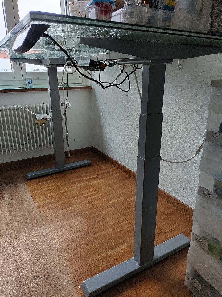 102 / 2x (!): Tischgestell 125 x 56 cm, höhenverstellbar, 220V, ev. mit CrashGlas-Tischplatte